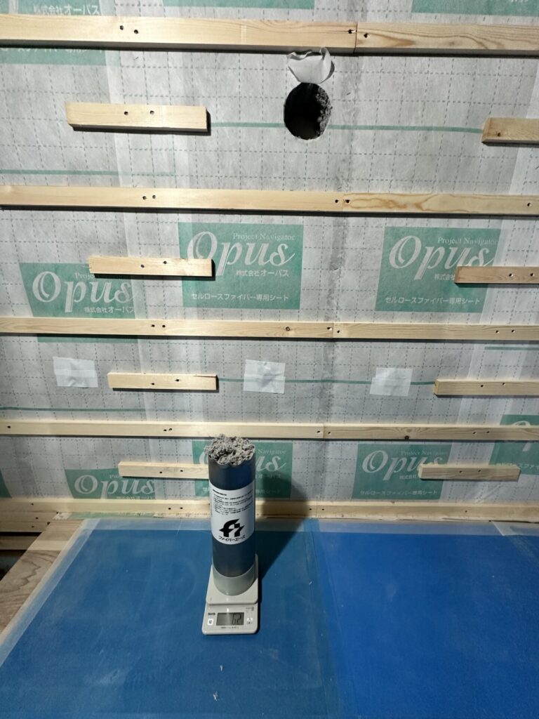 第三者の目でしっかりと施行できているか確認を受けていますがそれとは別に施工後の壁からセルロースをくり抜きしっかり規定のセルロースが入っているか重量をチェックしています!
