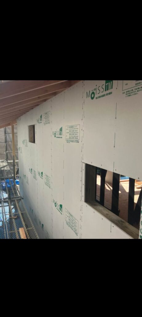 モイスは外壁の下地として使われていて、耐力面材としての強度はもちろん、調湿機能と防火性能を兼ね備えた素材です。