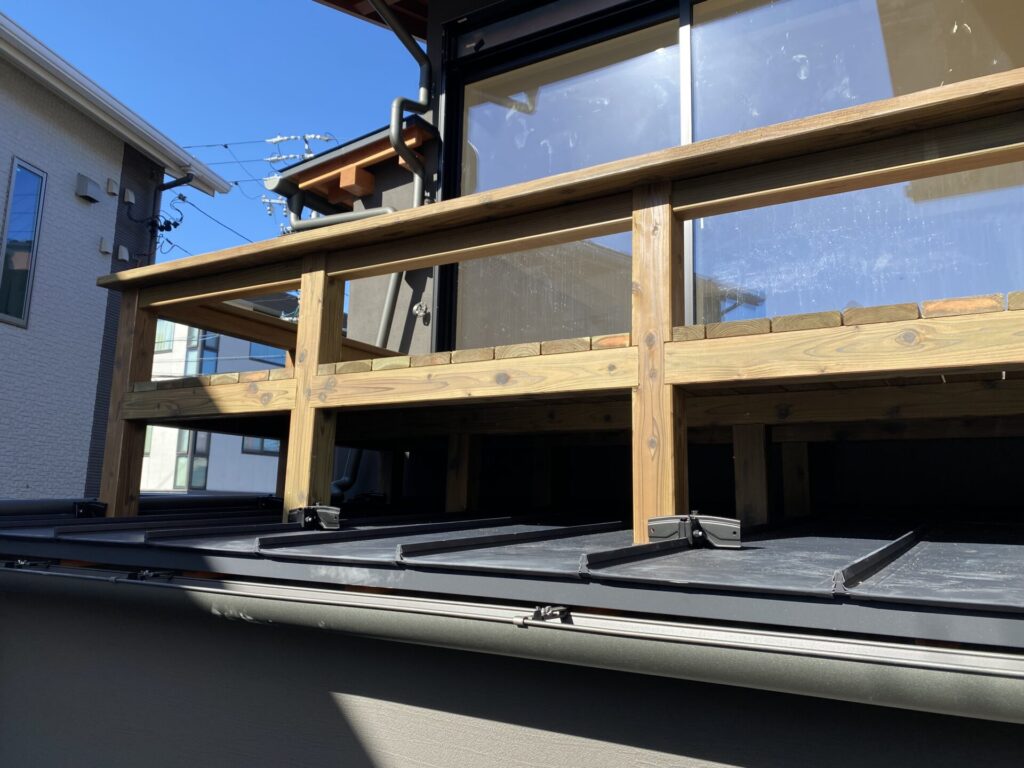 今回は下屋根の上のウッドデッキについてお話ししたいと思います。