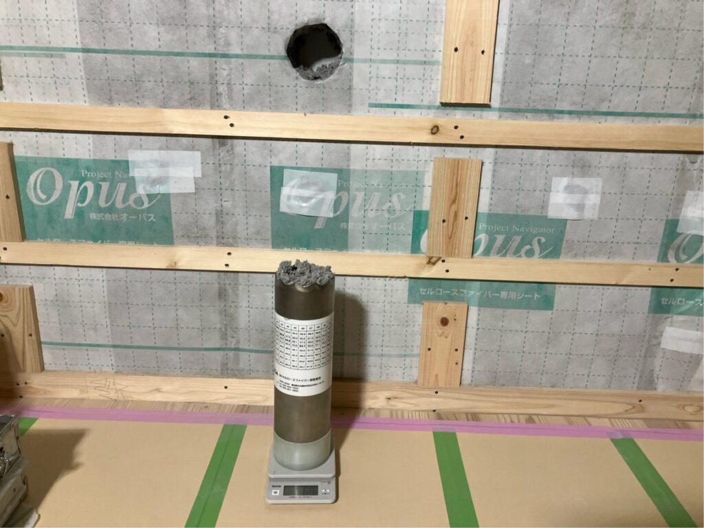 セルロース作業では、密度がとても大切などで吹き込みをした箇所を触って確認したり、グラム数が足りているか一部穴を開けて測って確認します。