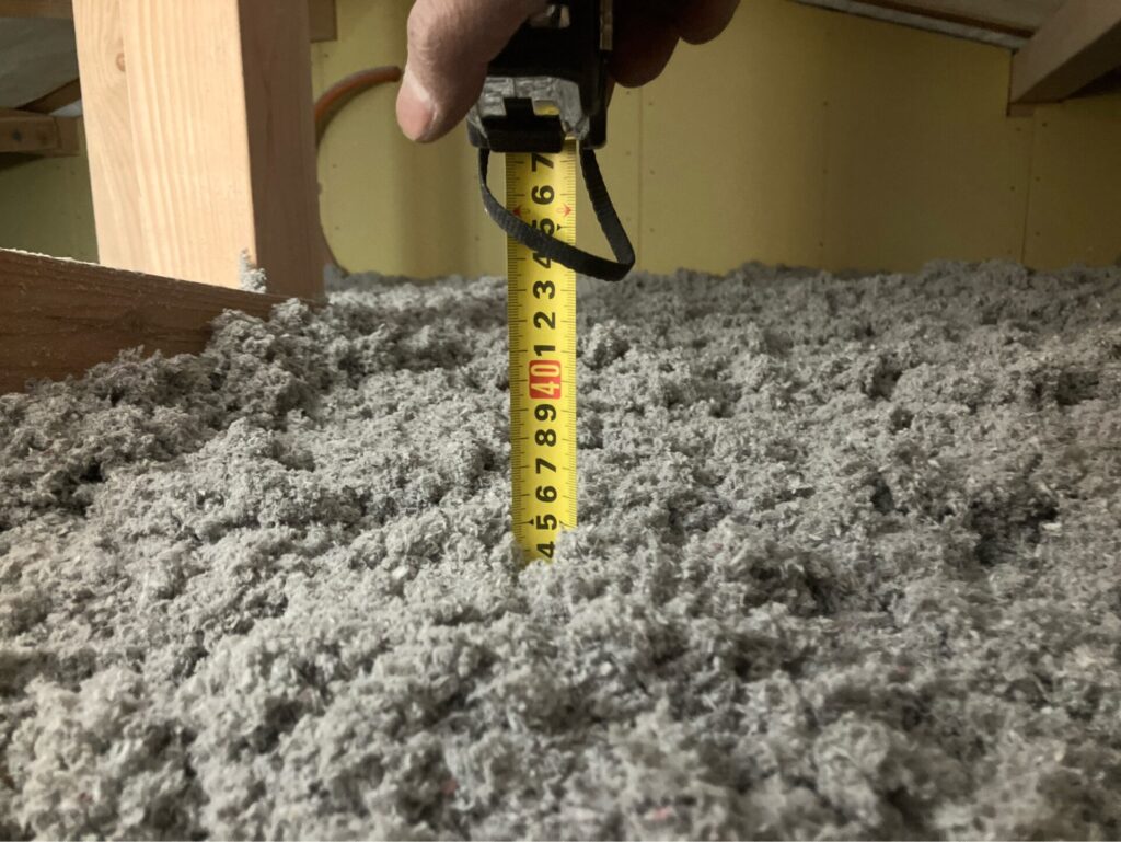天井部分では300ミリ以上になるよう吹き込み施工後はスケールを当ててしっかりと300ミリ以上吹き込めているか確認もしていきます。