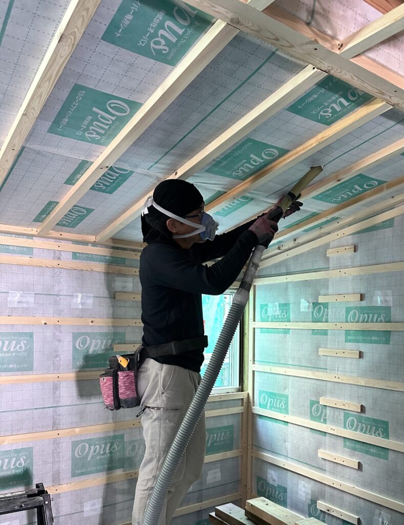 吹き込む前に壁にシートを貼る作業もありまして、全て含めると1週間ほど断熱のために時間を使っています。