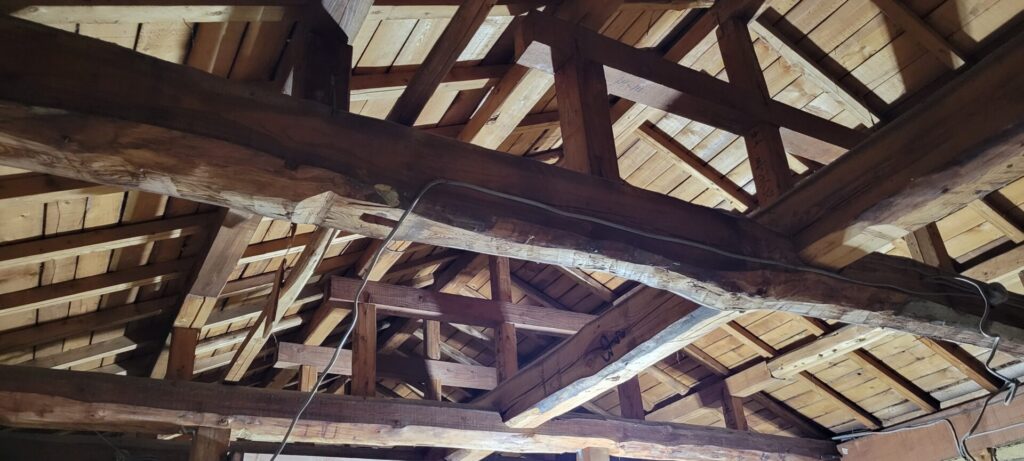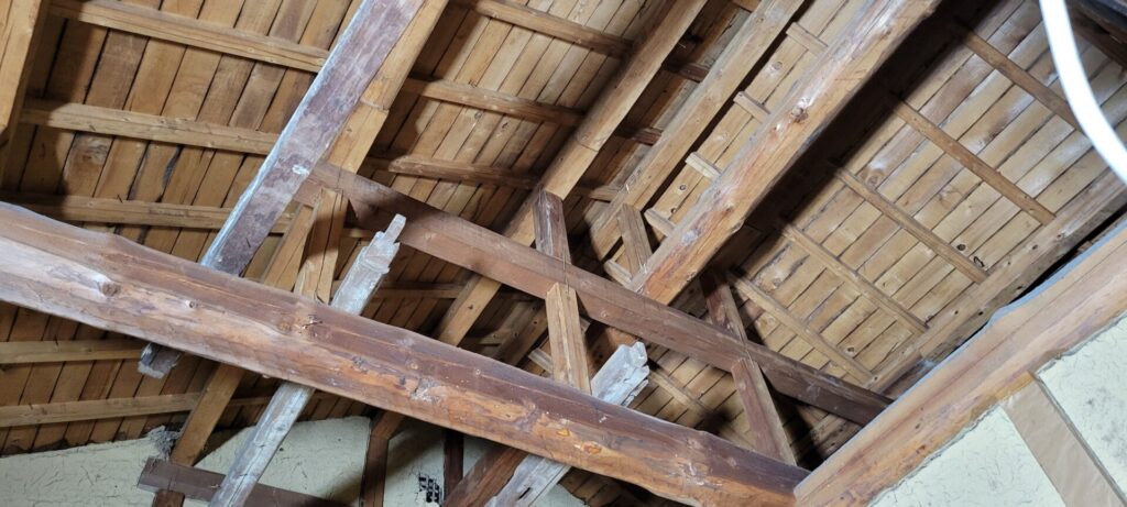 この屋根裏には、昔ながらの小屋組が残っていて、梁、束、母屋と呼ばれるものがしっかり連動して荷重を支える構造になっています。