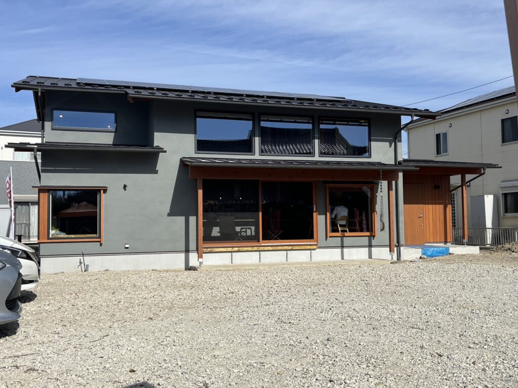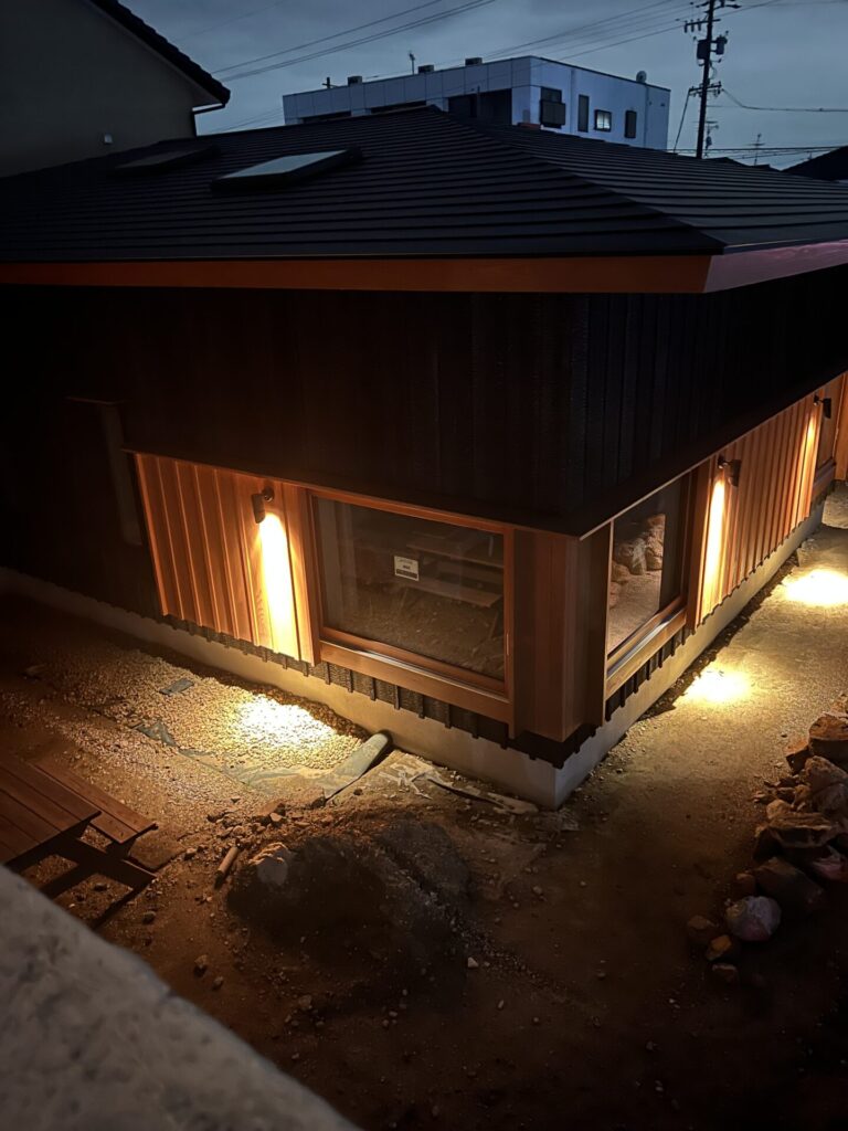 夕方の日暮れ時、外壁のあたたかい灯りがすごく印象的でした。黒と木目の組み合わせが落ち着いていて、外から見ても“ここに住んだら心が安らぎそうだな”と感じます。