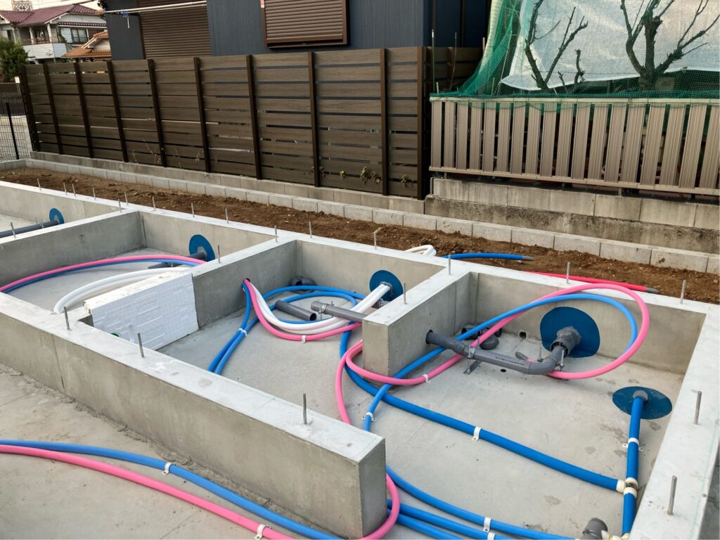 外周部の基礎貫通している配管は基礎配管作業後に隙間を埋める様にコシシーラーを打ちます。