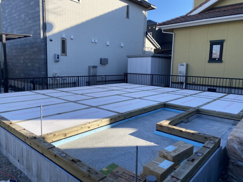 土台と剛床が完成すると、現場はしっかりとした足元になり、