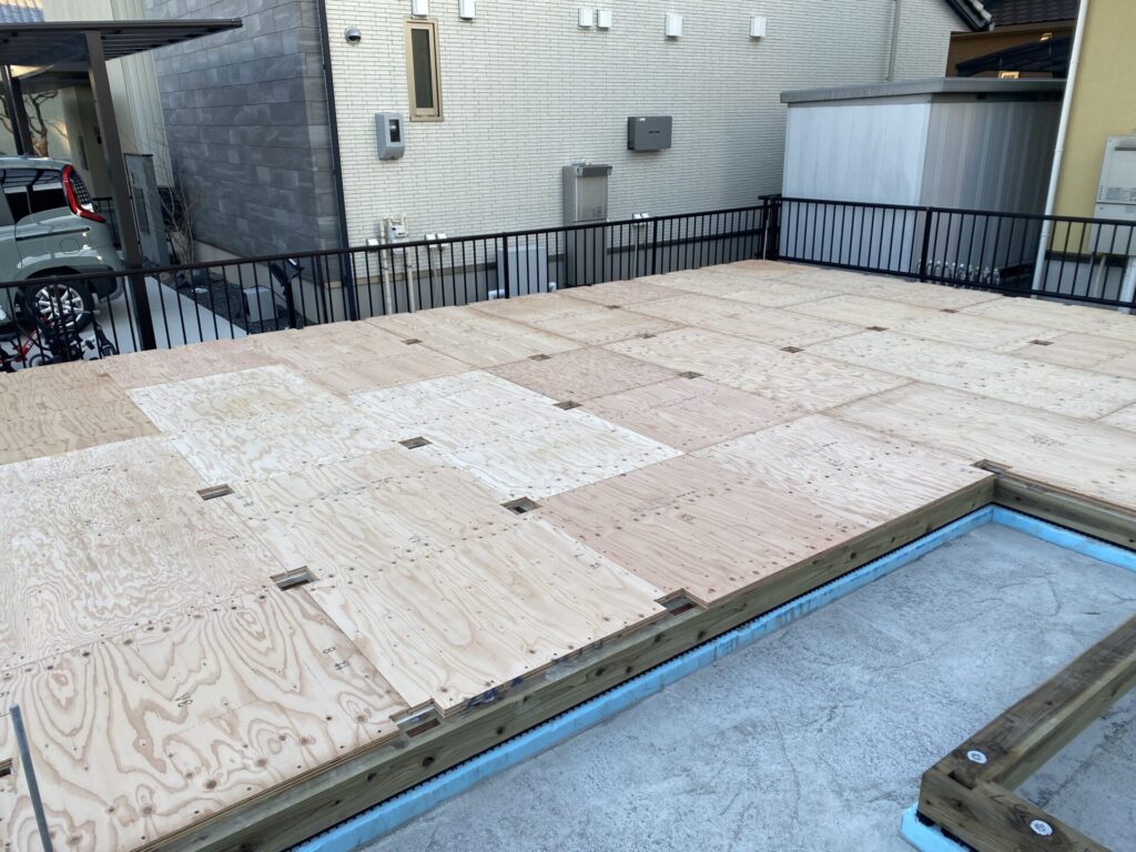 通常の床よりも厚みのある構造用合板を使い、梁や土台に直接しっかり固定します。
