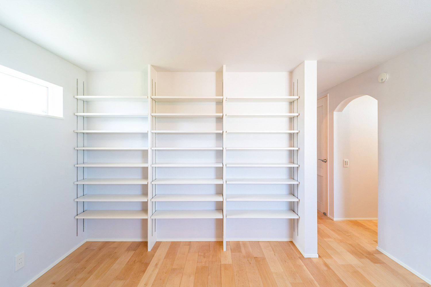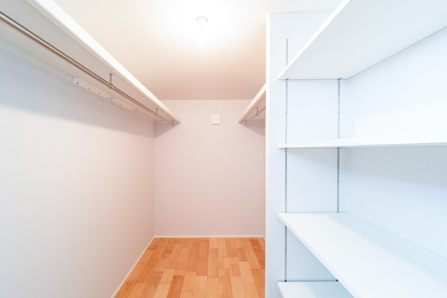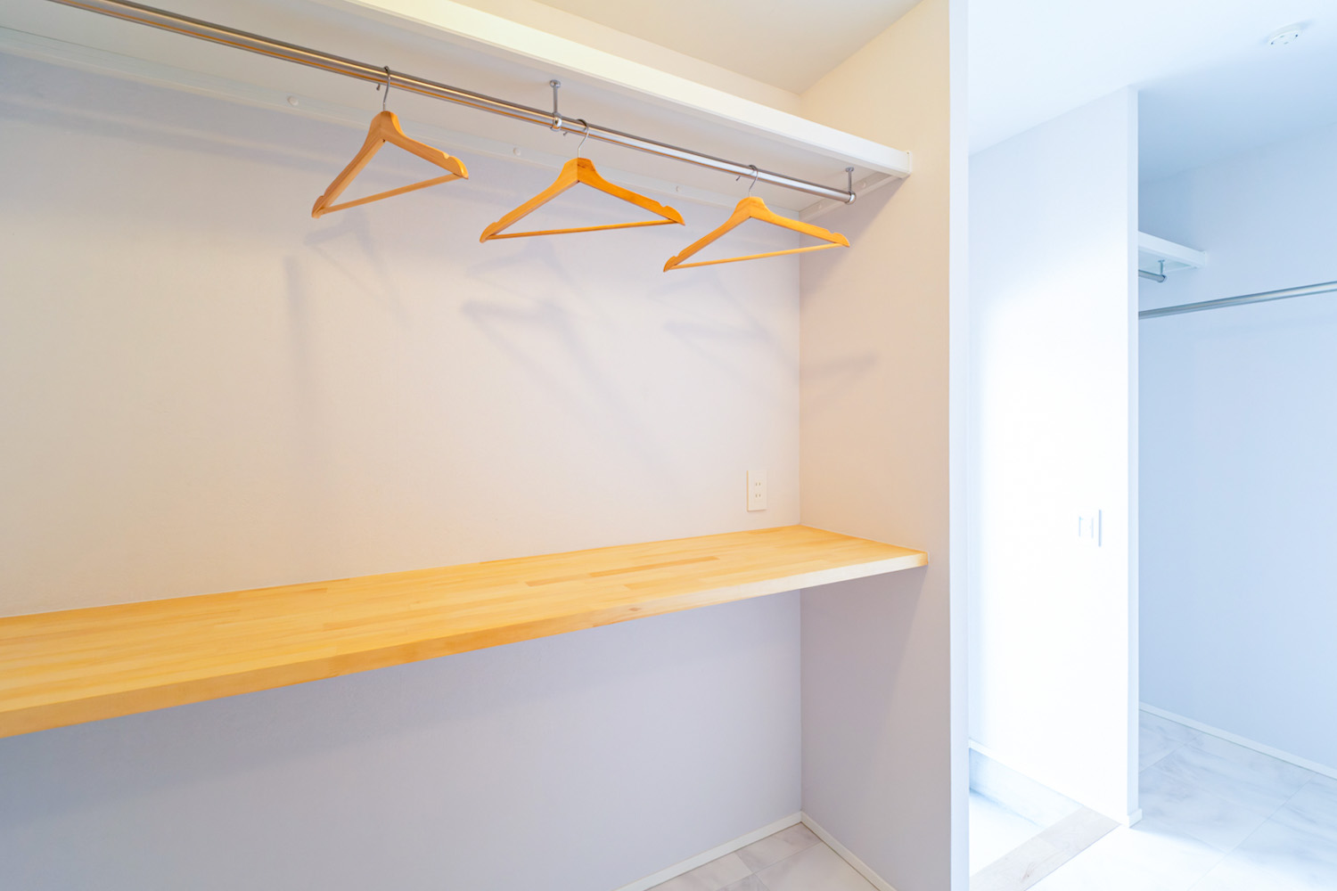 そしてこの主寝室の大きな特徴は、なんとウォークインクローゼットが2つあること。4帖と2.25帖の2か所に分かれており、家族やライフスタイルに合わせて使い分けが可能です。ハンガーパイプや可動棚も設けられており収納力は抜群。洋服や小物だけでなく、季節物の寝具やスーツケースまでしっかり収められます。日常の整理整頓がスムーズになることで、より暮らしの質も高まります。