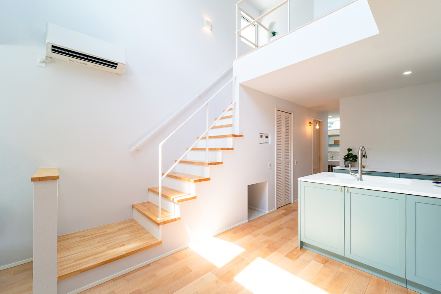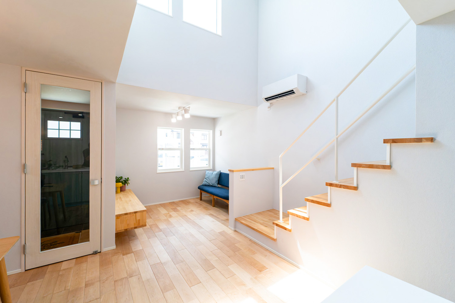16帖のLDKは、吹き抜けがあるため実際の帖数以上に広く感じます。高窓からも光が入り、とっても気持ちいい!リビングは少し奥に入った場所に設けられ、落ち着きのある雰囲気。あえて掃き出し窓にせず、小窓にしたことで家具の配置も自由にでき、外からの視線も気になりません。