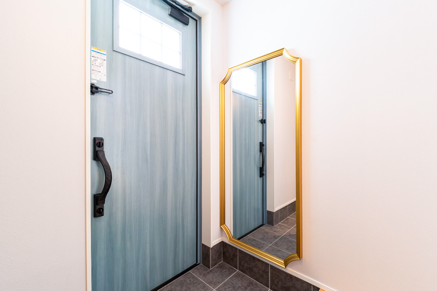 玄関に入ると、まず印象的なのは大きなミラーや照明、フックがゴールドで統一されてとってもおしゃれ。カリフォルニアらしいデザインを取り入れながらも、華美になりすぎず洗練された空間を演出しています。