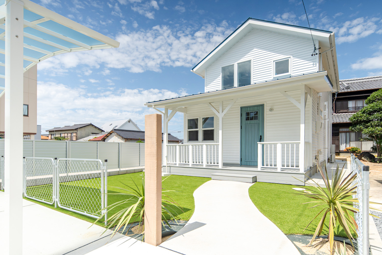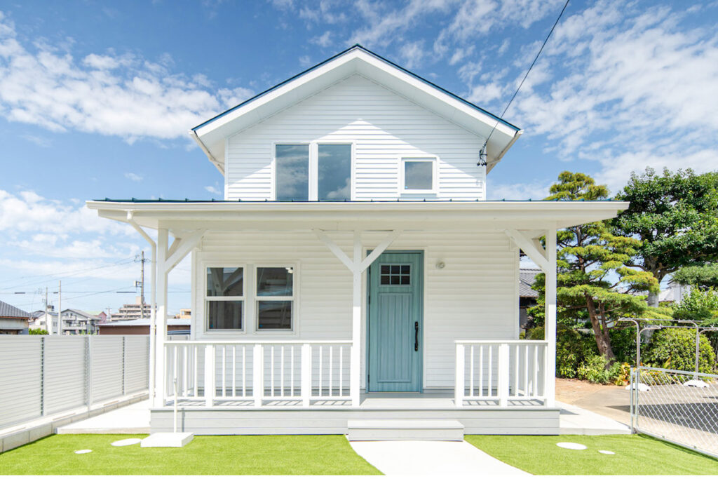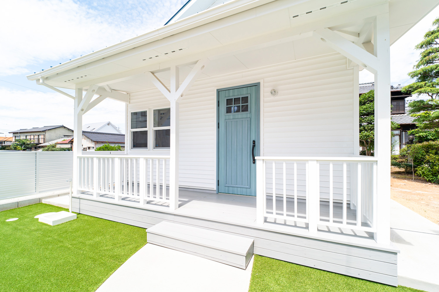 外観は白いラップサイディングの外壁に、鮮やかなブルーの玄関扉。まるで西海岸を感じさせる爽やかな雰囲気です。カリフォルニアスタイルならではのカバードポーチは、腐らない木「ラグウッド」をグレーに塗装した床材がアクセントになっています。