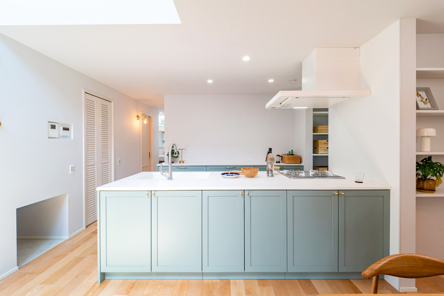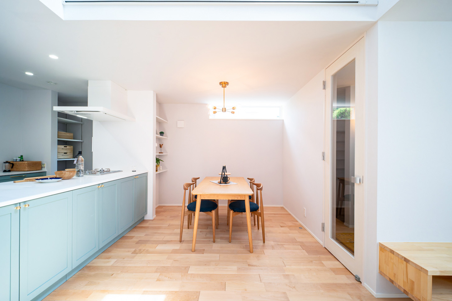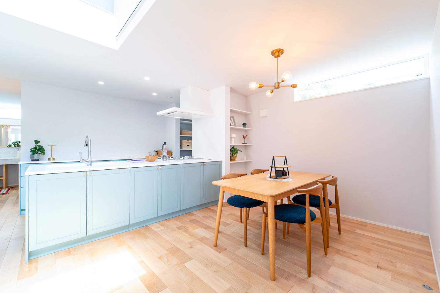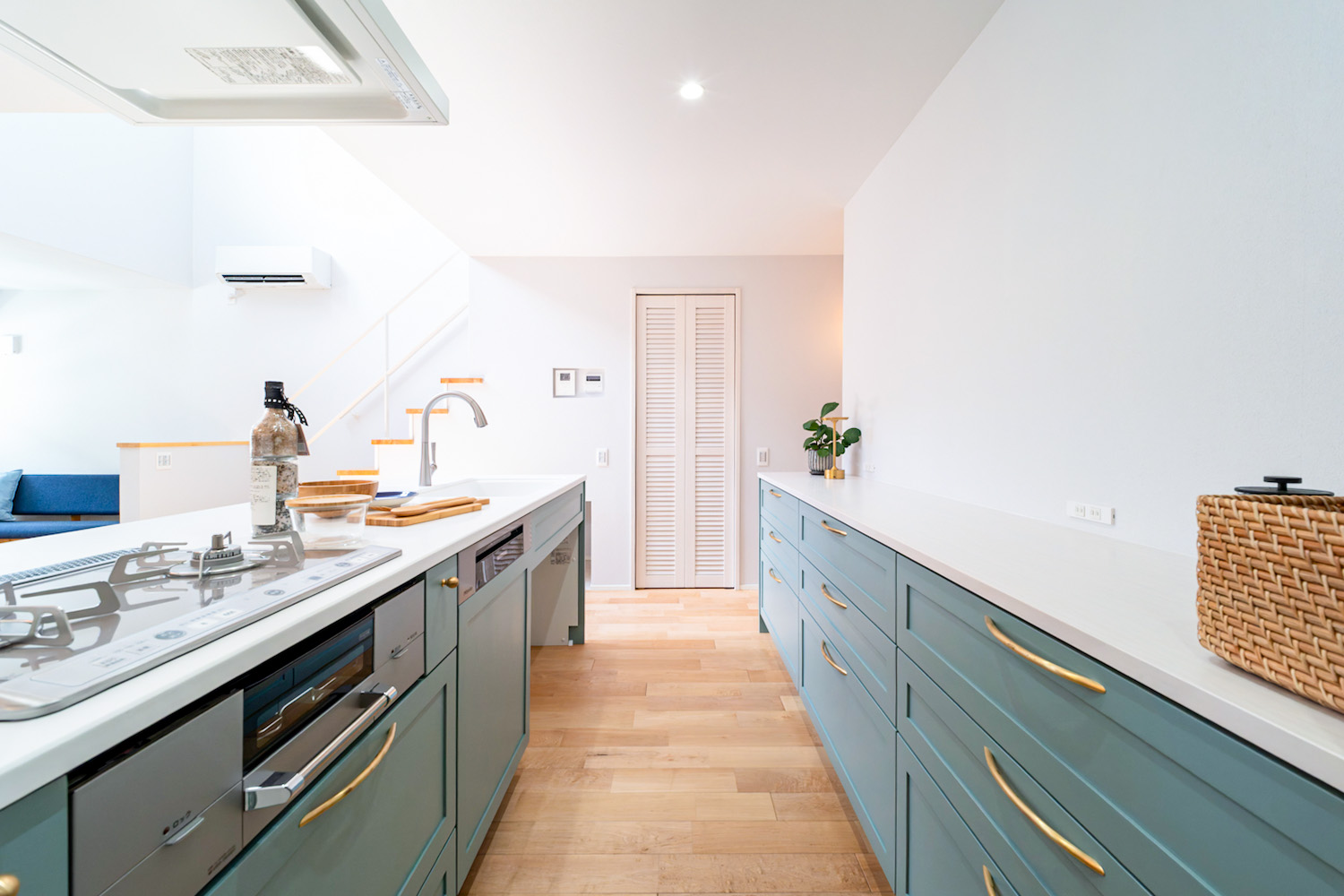 LDKの中心には素敵なキッチンがあります。ウッドワンの木製キッチンを採用しました。無垢材の扉にブルーの塗装し、取っ手をゴールドにするなど、細部までこだわっています。ミーレの食洗機もついており、デザイン性と機能性を兼ね備えたキッチン。収納もキッチンの前面収納やカップボード、パントリーとあり大容量。これだけあれば食材や日用品をすっきり片付けられます。お料理をしながら、ダイニングやリビングにいる家族とコミュニケーションが取れるのも嬉しいポイントです。