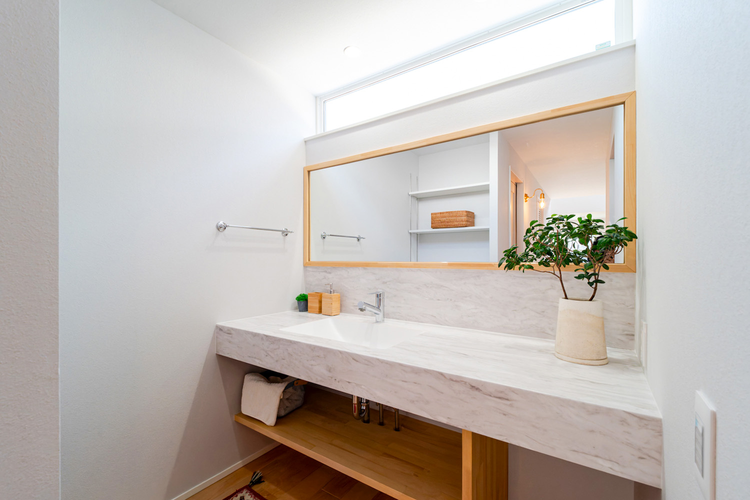 洗面スペースにはアイカのスタイリッシュカウンターを採用。石目調のデザインがカリフォルニアスタイルとよく馴染みます。幅広のカウンターに大きな一面鏡があるので、朝の準備もスムーズ。背面には造作の収納棚もあるため、タオルや洗面用品をすっきり片付けられて便利です。